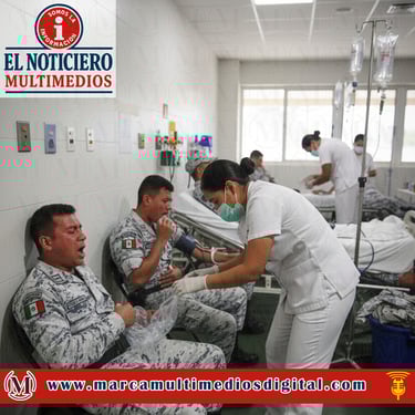 Autoridades atienden emergencia sanitaria por presunta intoxicación alimentaria en la base de la Guardia Nacional.